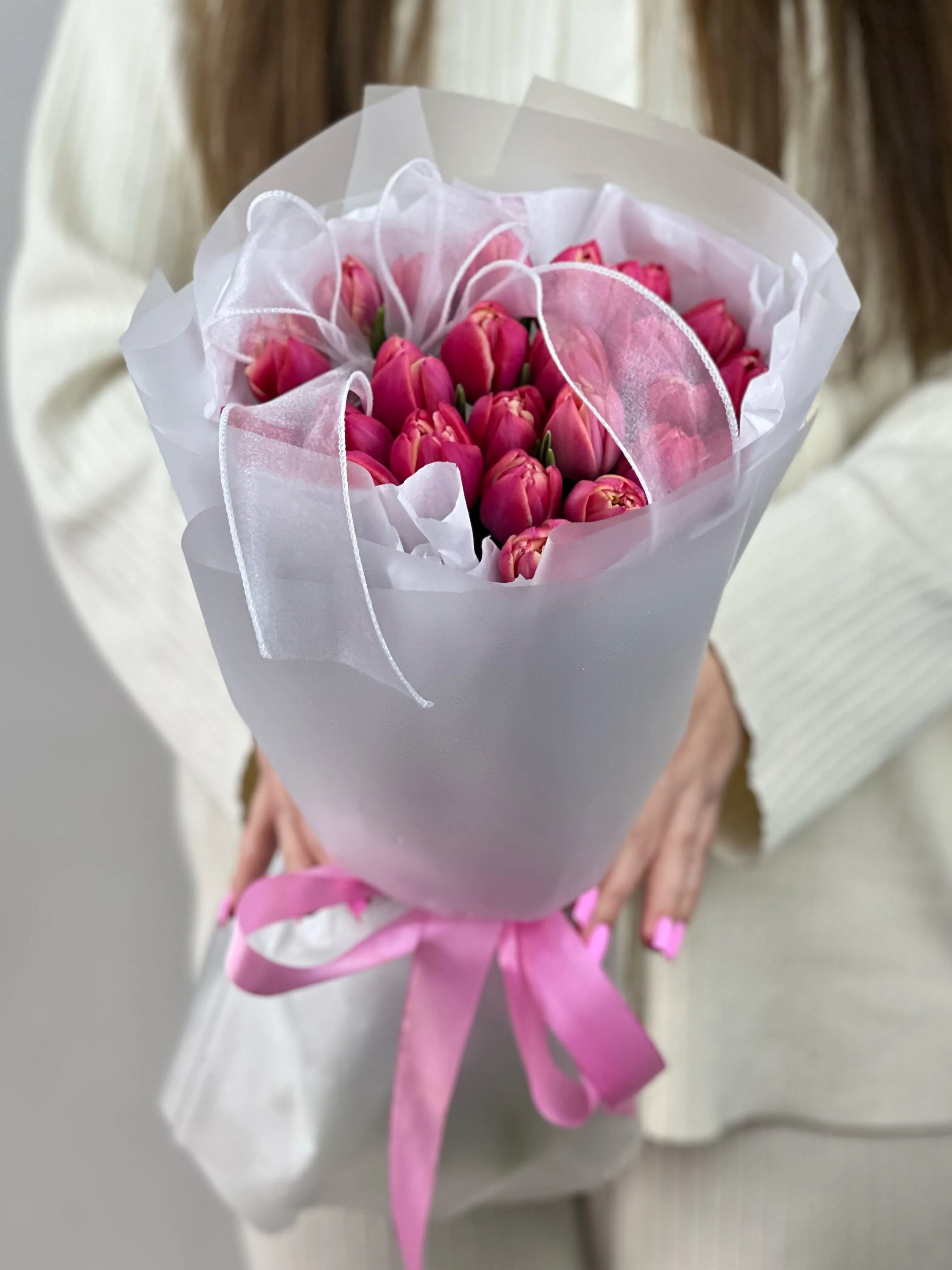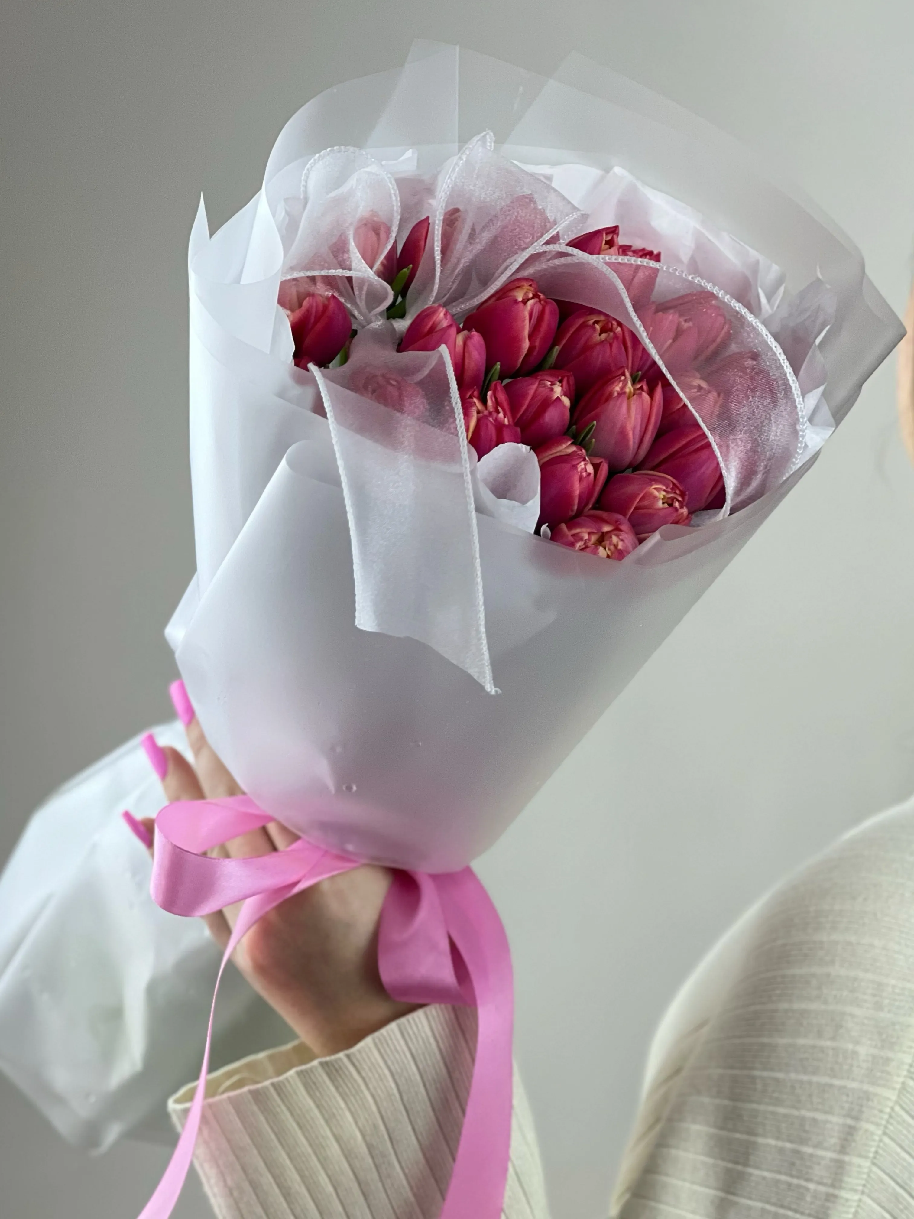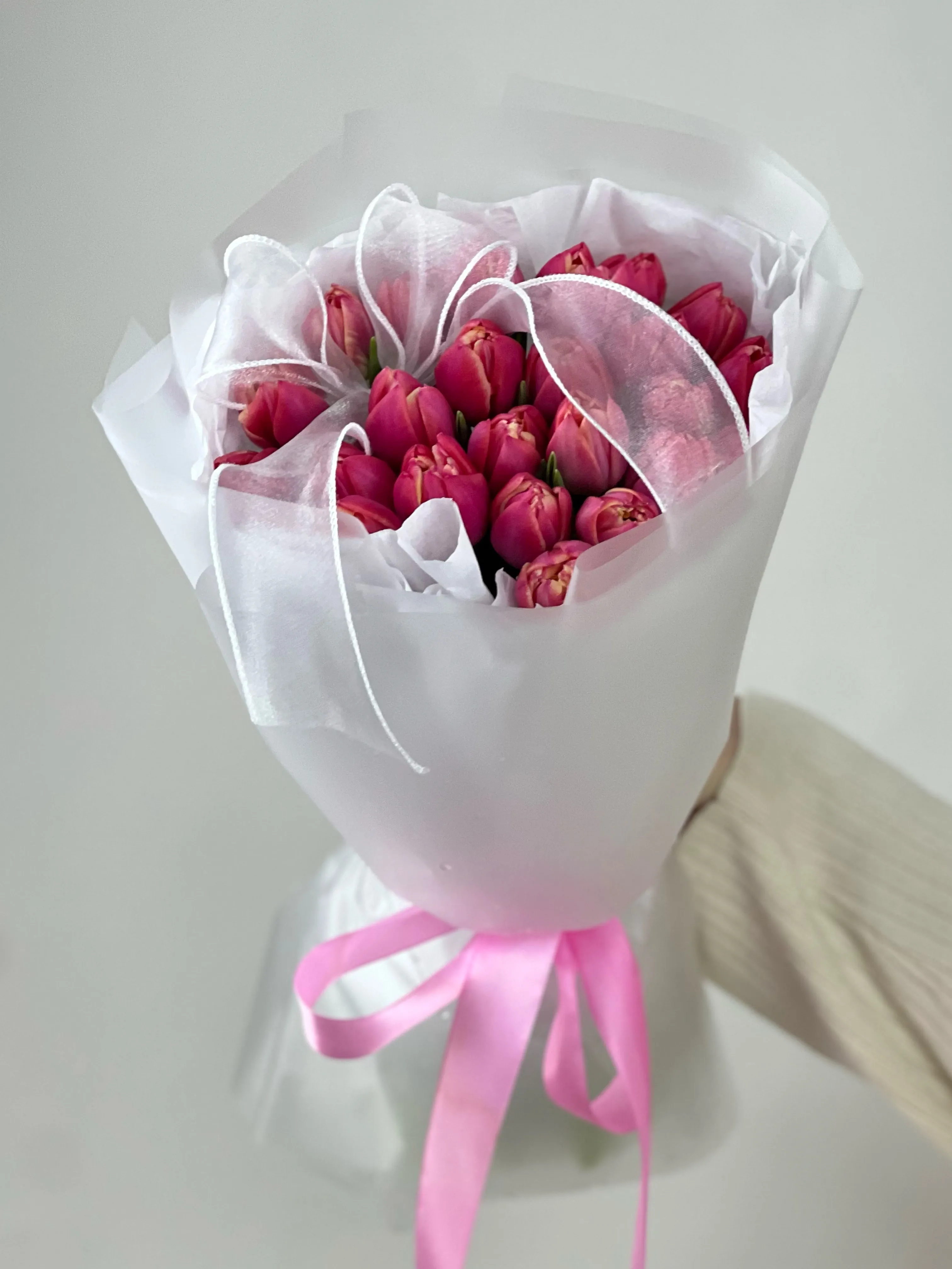 Букет розовых тюльпанов — это нежность и романтика в каждом лепестке. Их мягкий оттенок символизирует восхищение, заботу и теплые чувства. Такой букет подарит весеннее настроение, станет трогательным подарком для любимого человека или изысканным акцентом в интерьере.