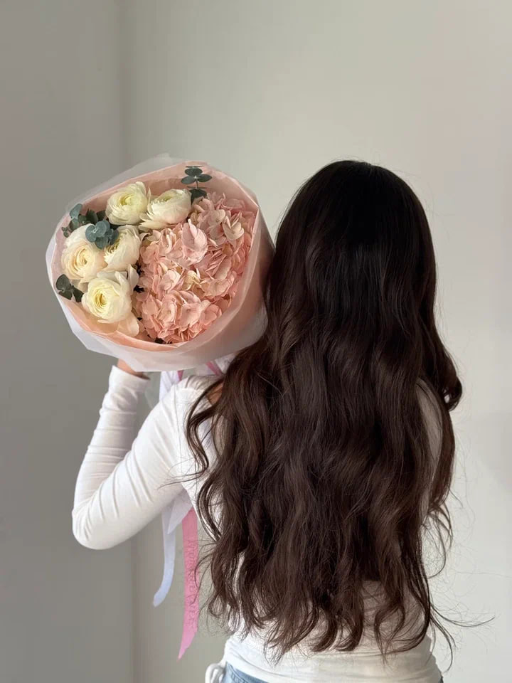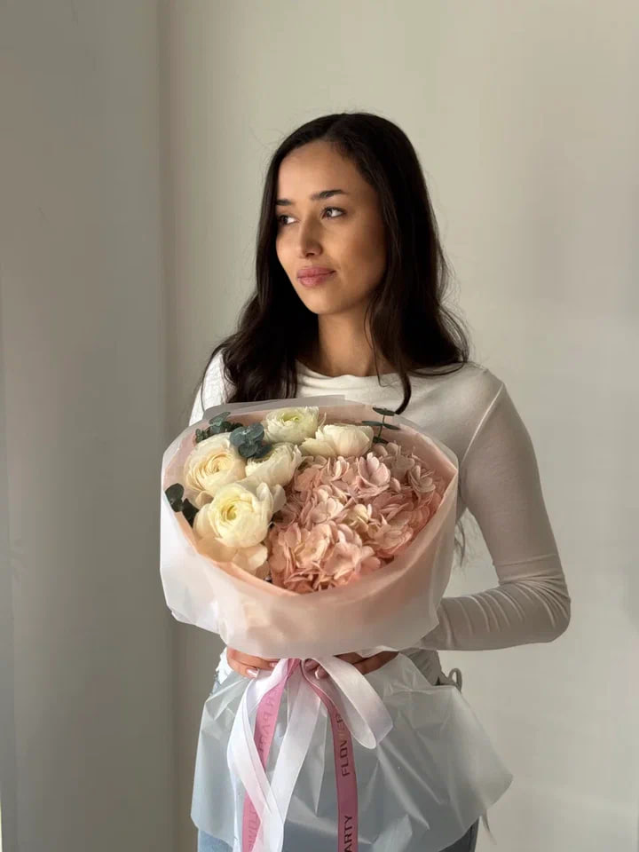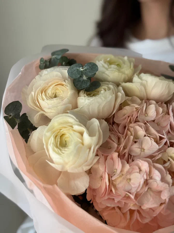 Авторский сборный букет с ранункулюсами — это нежное сочетание изысканных цветов, создающее атмосферу гармонии и романтики. Идеальный подарок для тех, кто ценит утонченность и красоту.