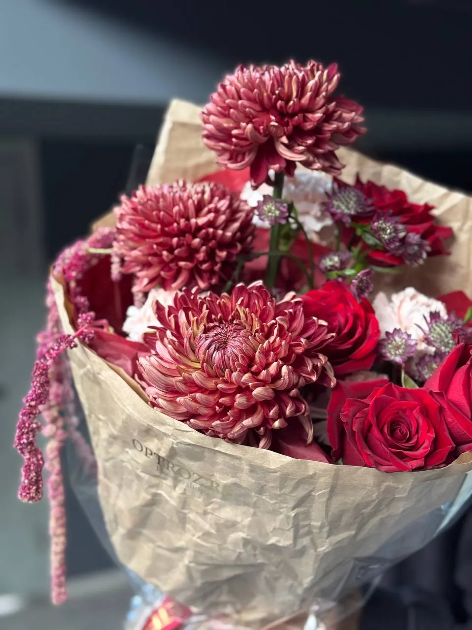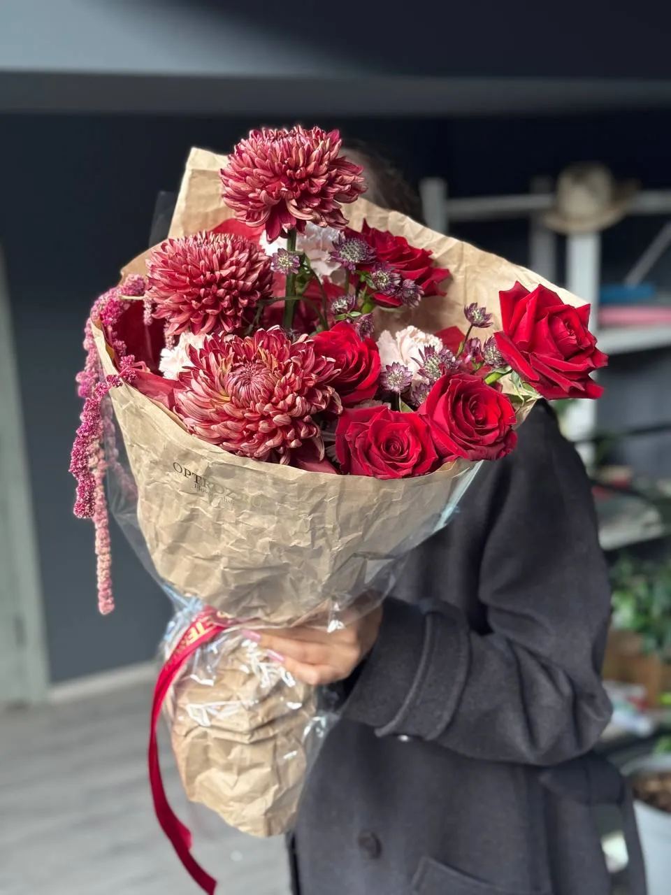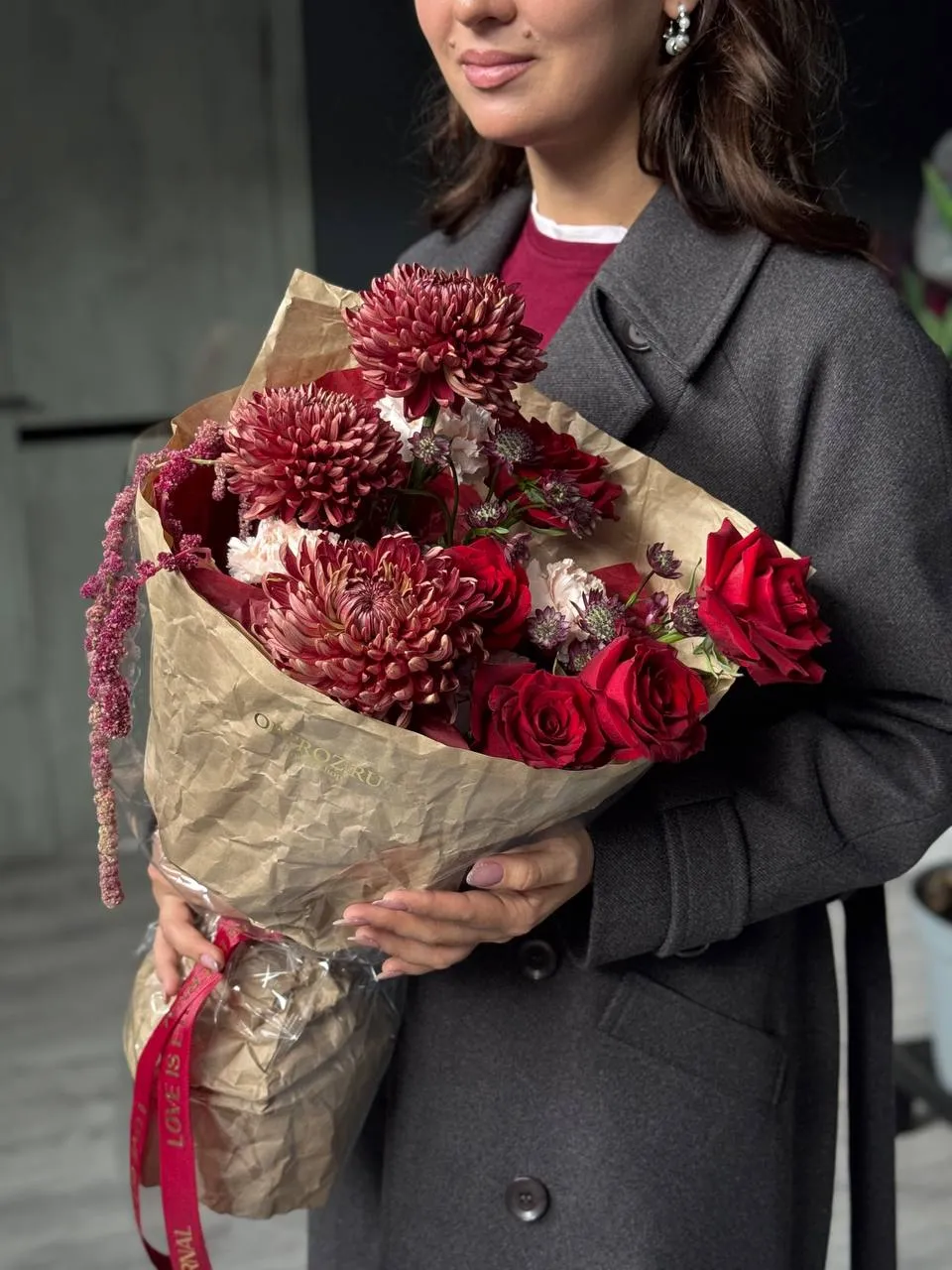Пламенный осенний дуэт! Алые розы — символ страсти, в обрамлении бархатных хризантем «бигуди». Этот букет словно горящий костер — яркий, теплый и бесконечно прекрасный.