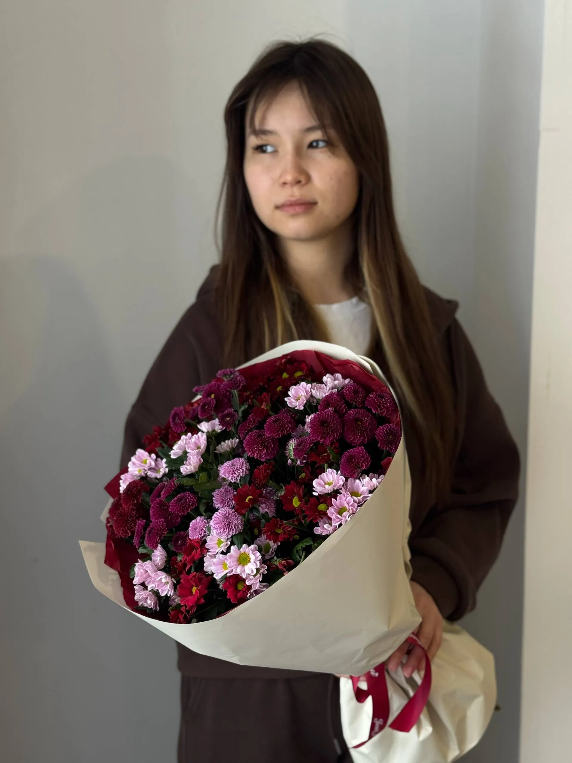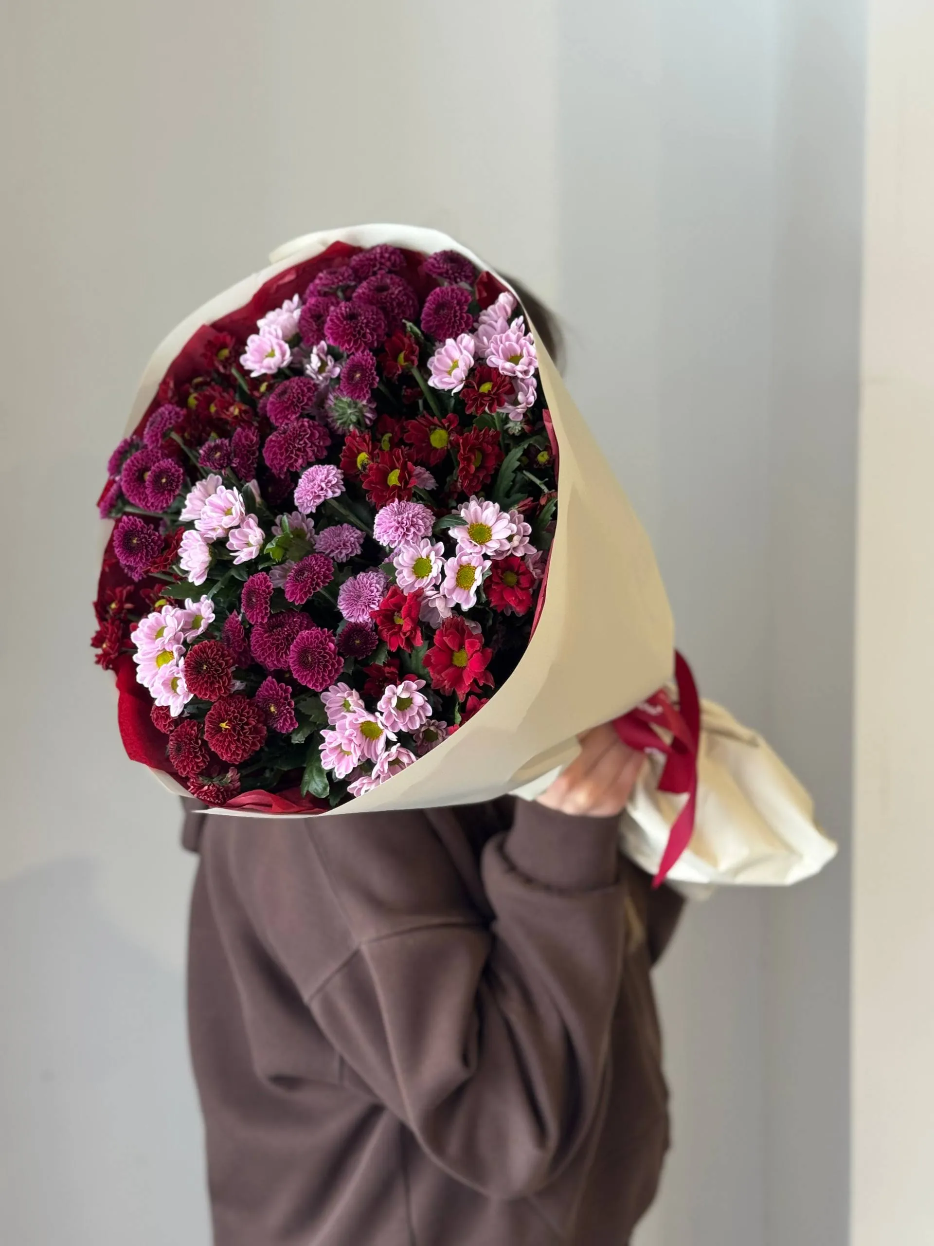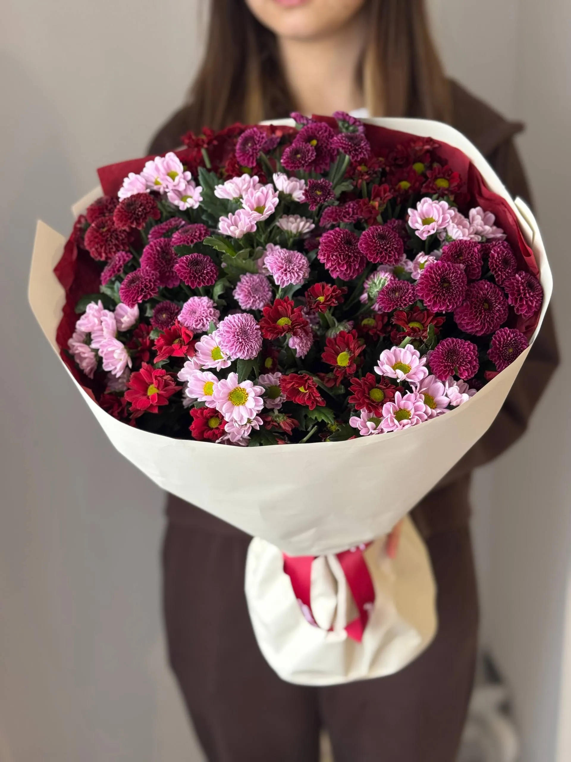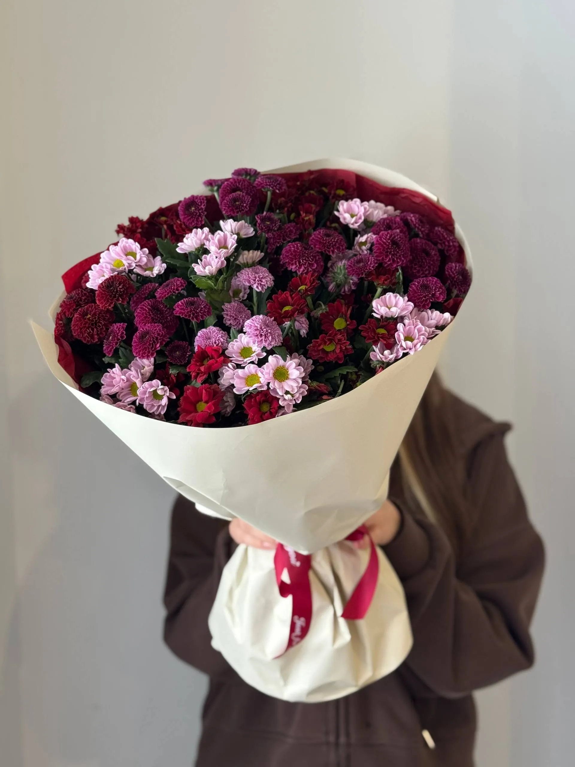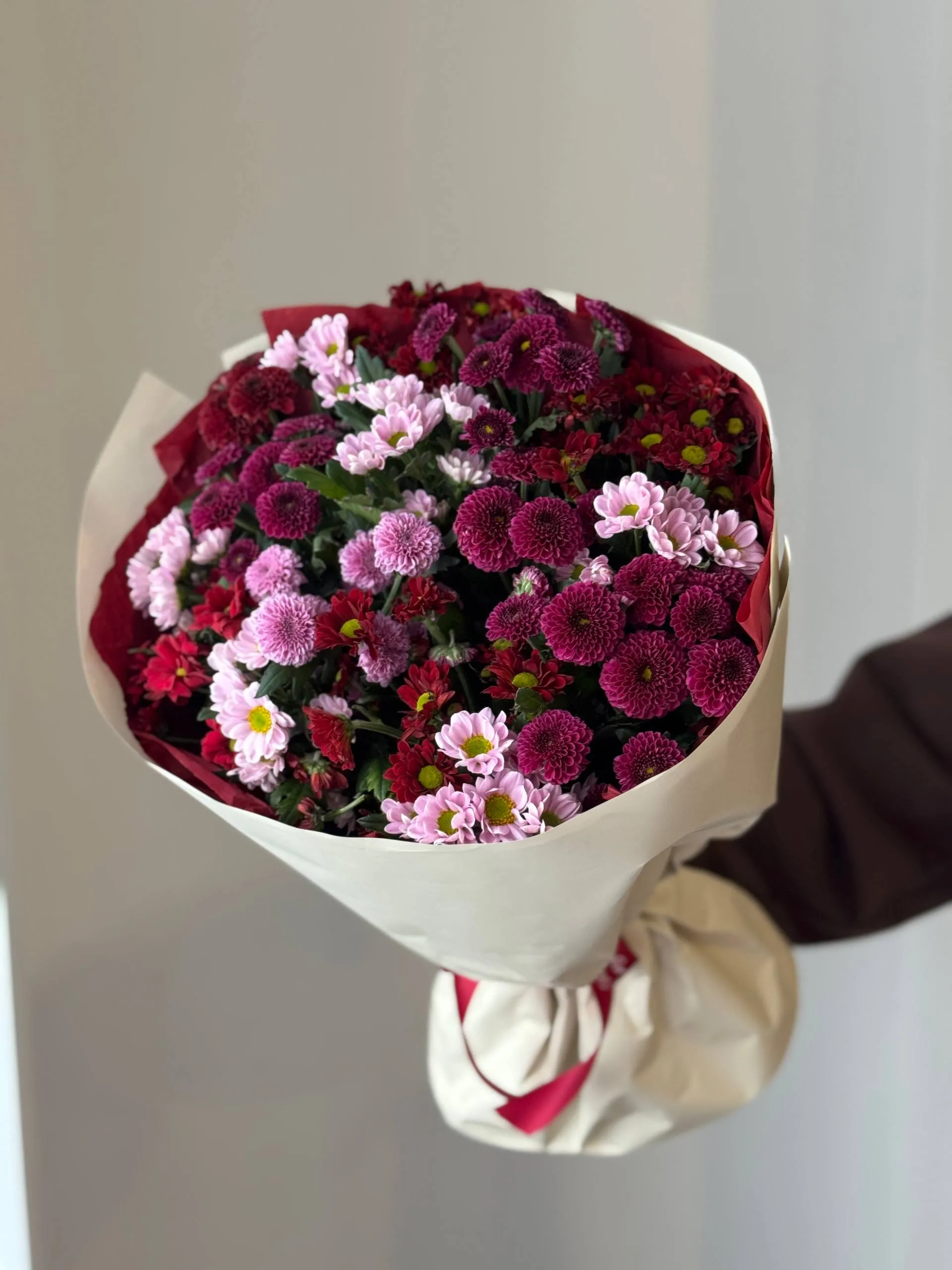 Этот изысканный букет из хризантем Сантини порадует вас своей элегантностью и свежестью. Идеальный выбор для подарка или украшения интерьера, он создаст атмосферу уюта и красоты.