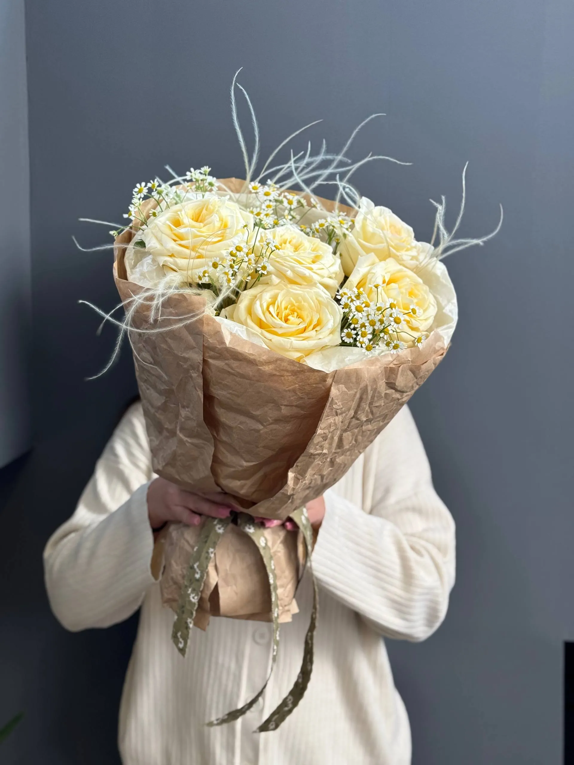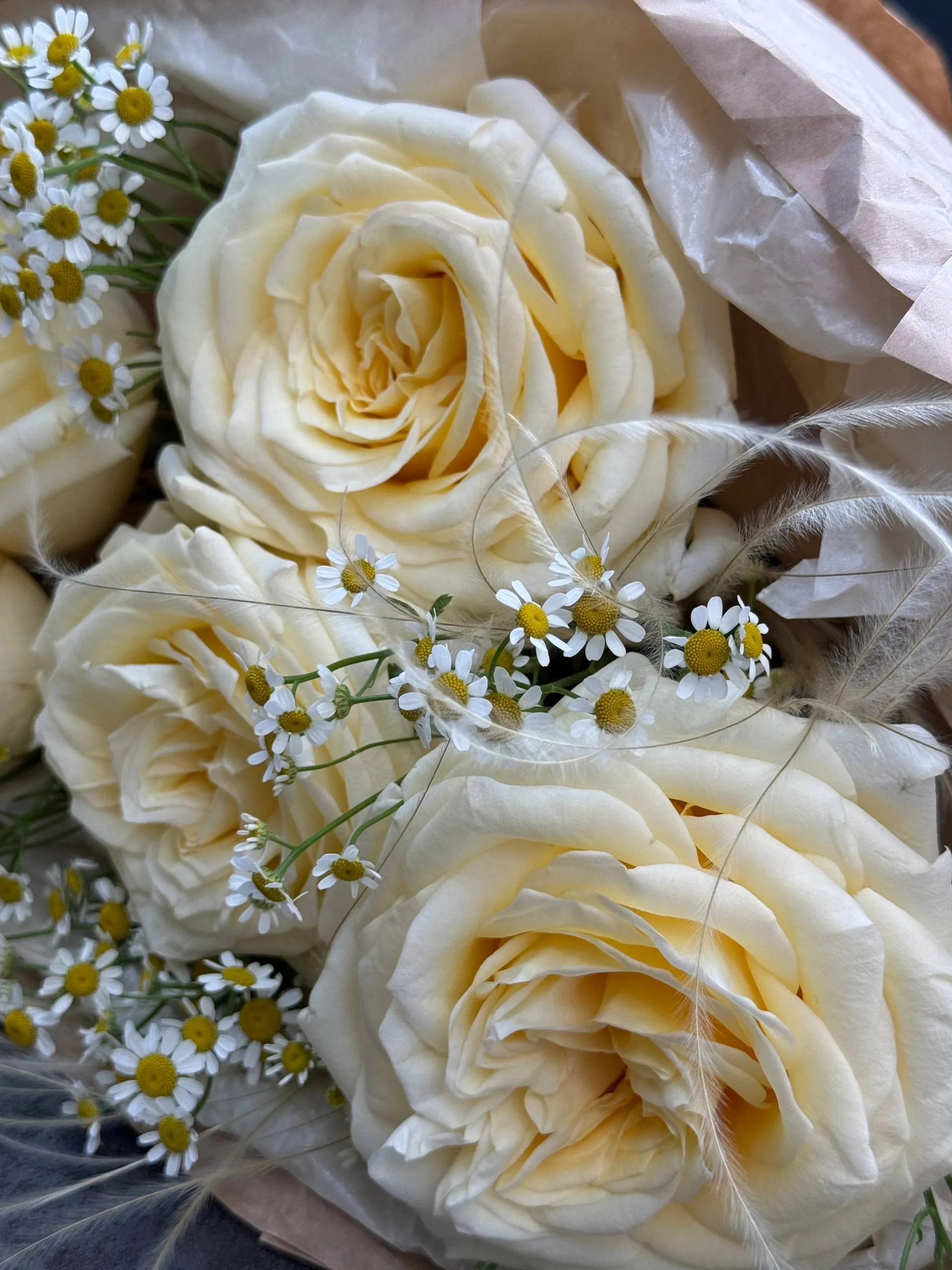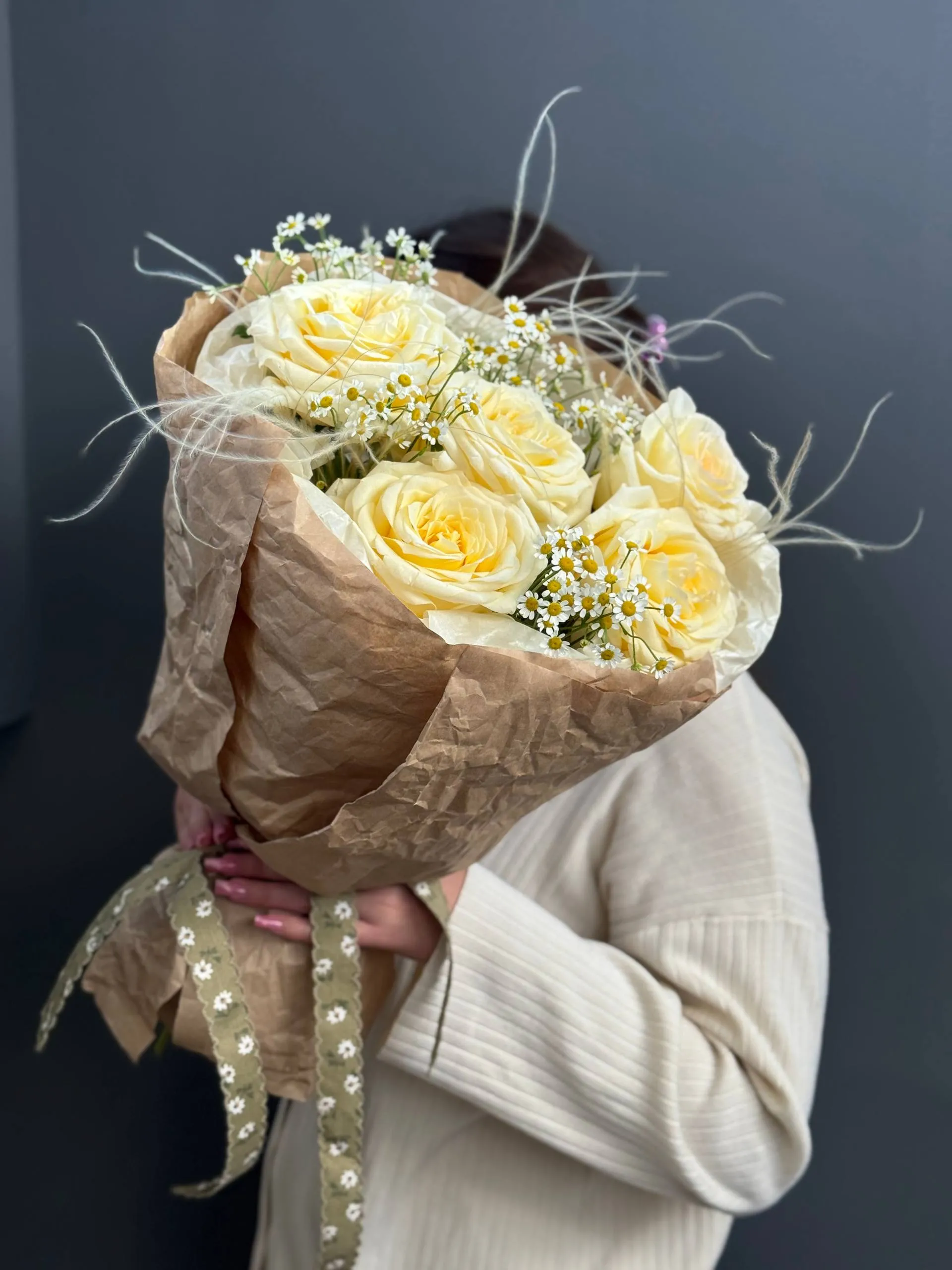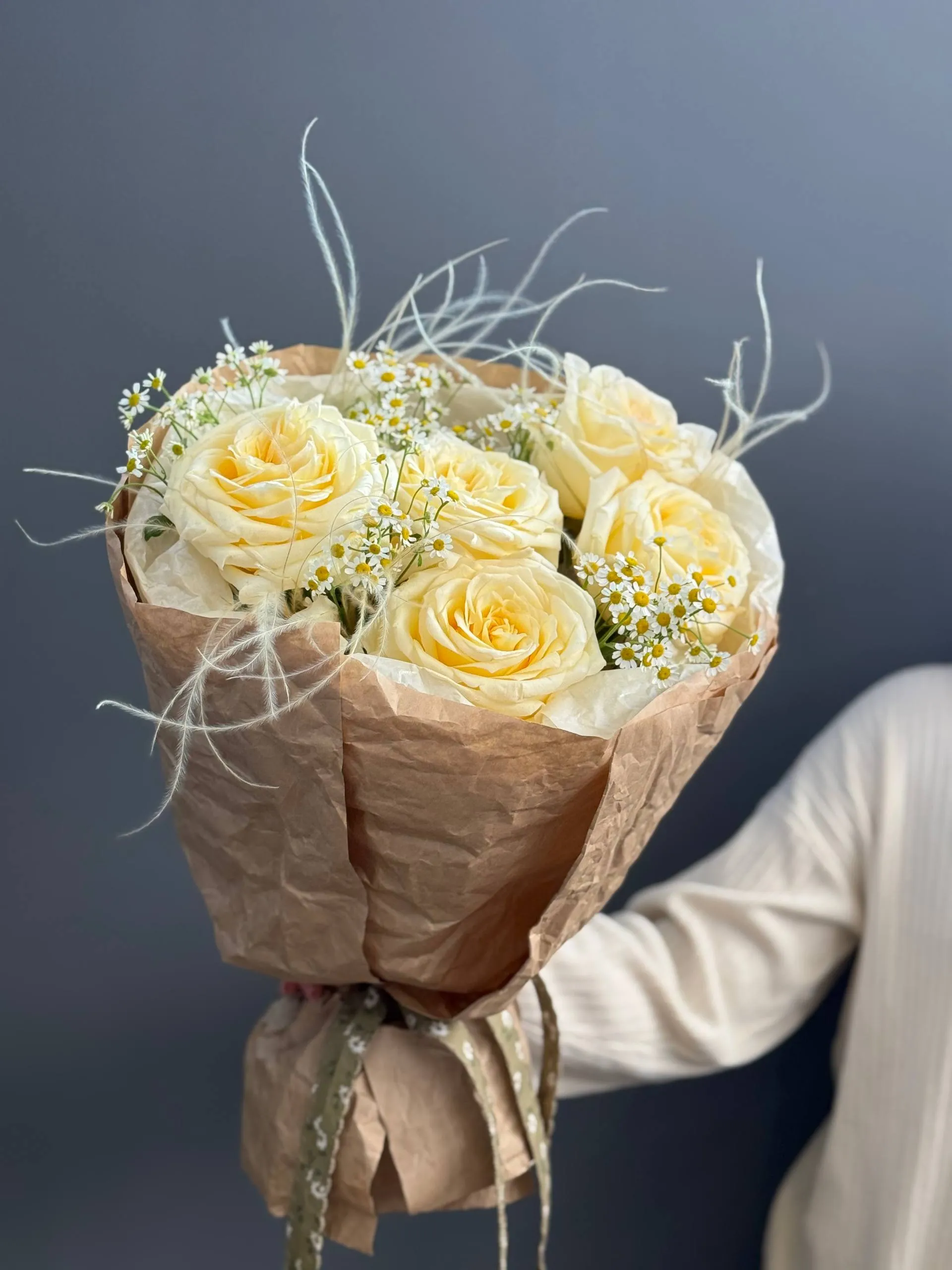 Этот изысканный букет из роз сорта Канделайт и матрикарий — символ нежности и элегантности. Идеально подойдет для выражения любви, благодарности или просто чтобы порадовать близких.