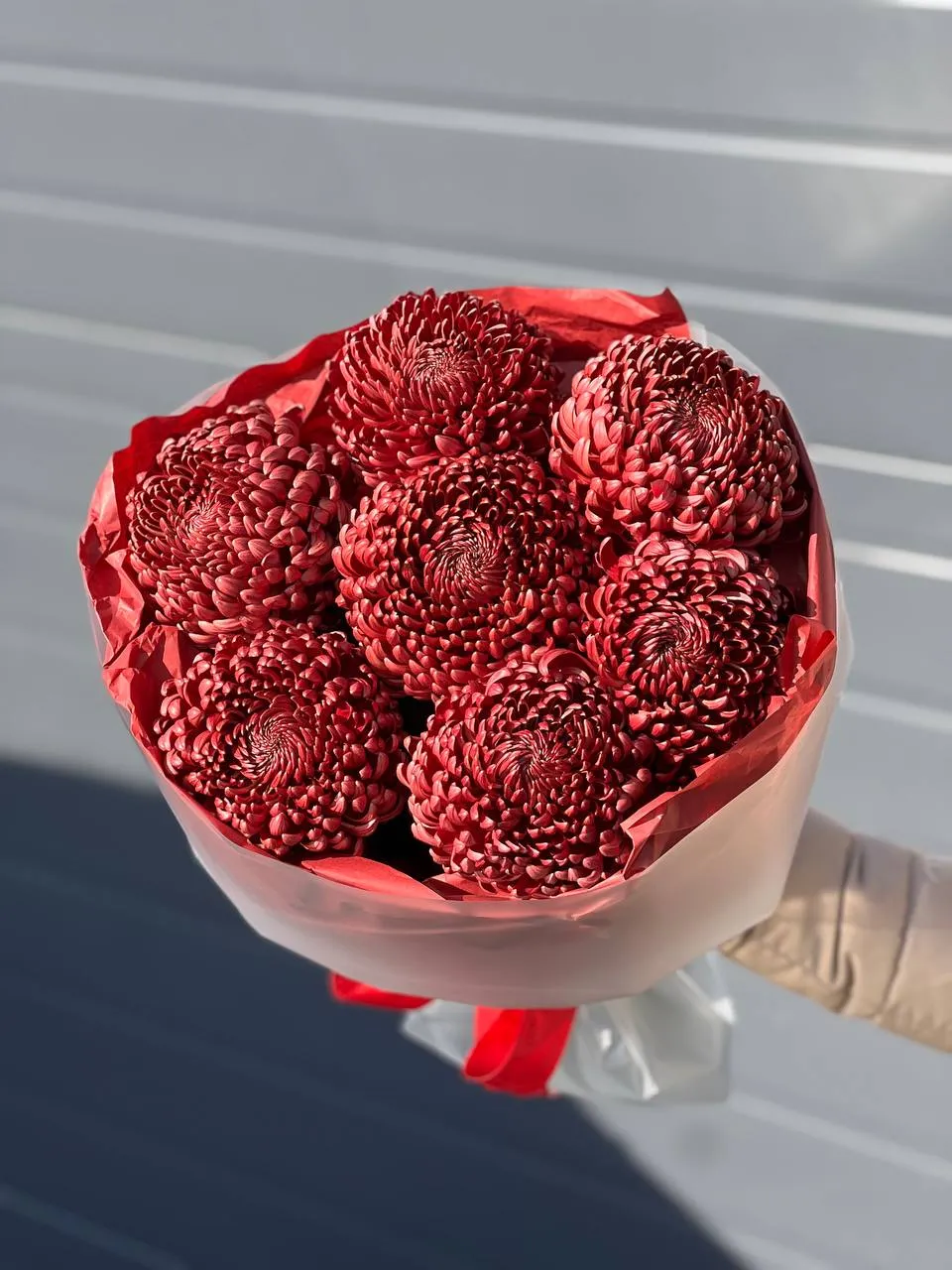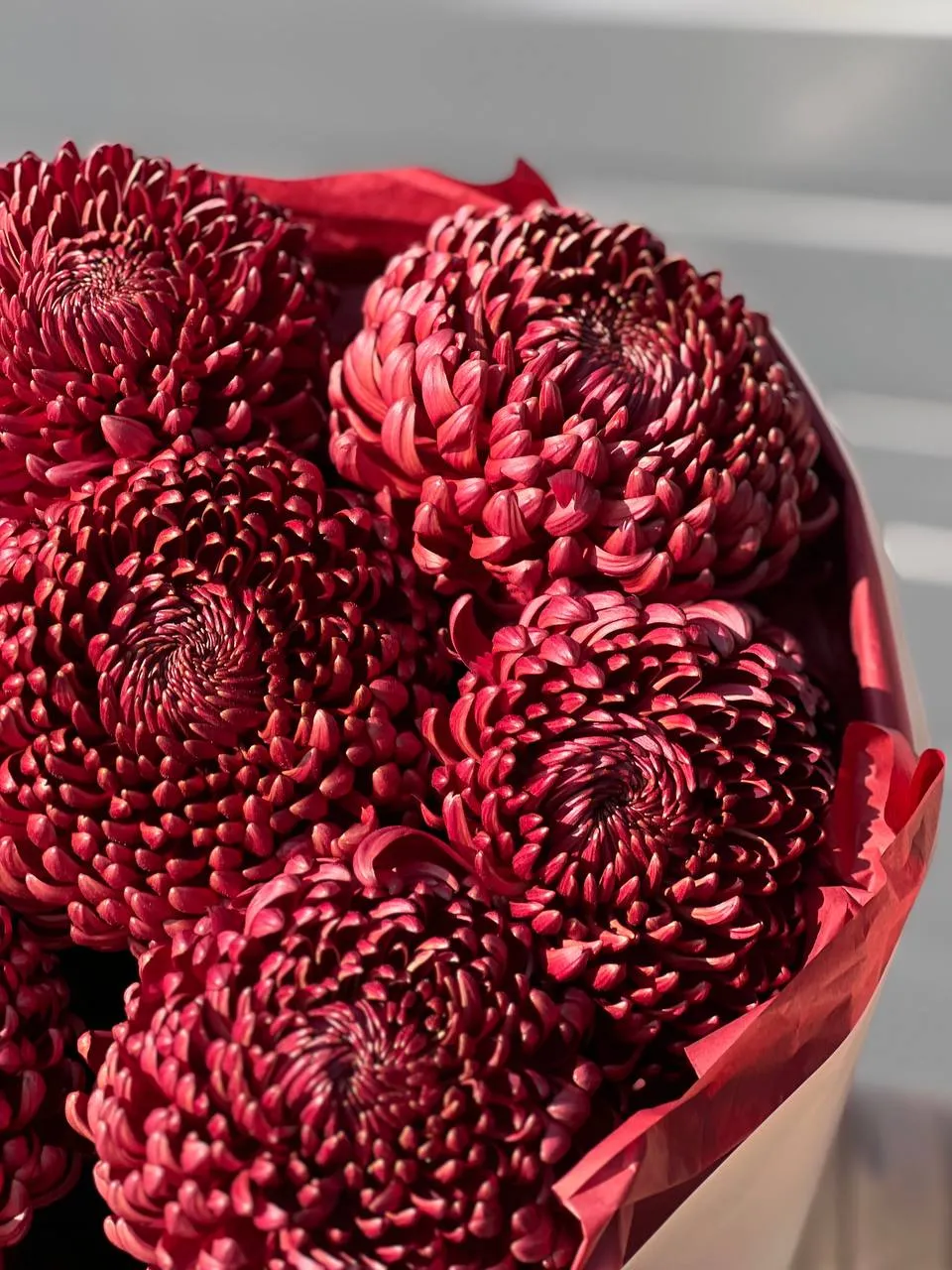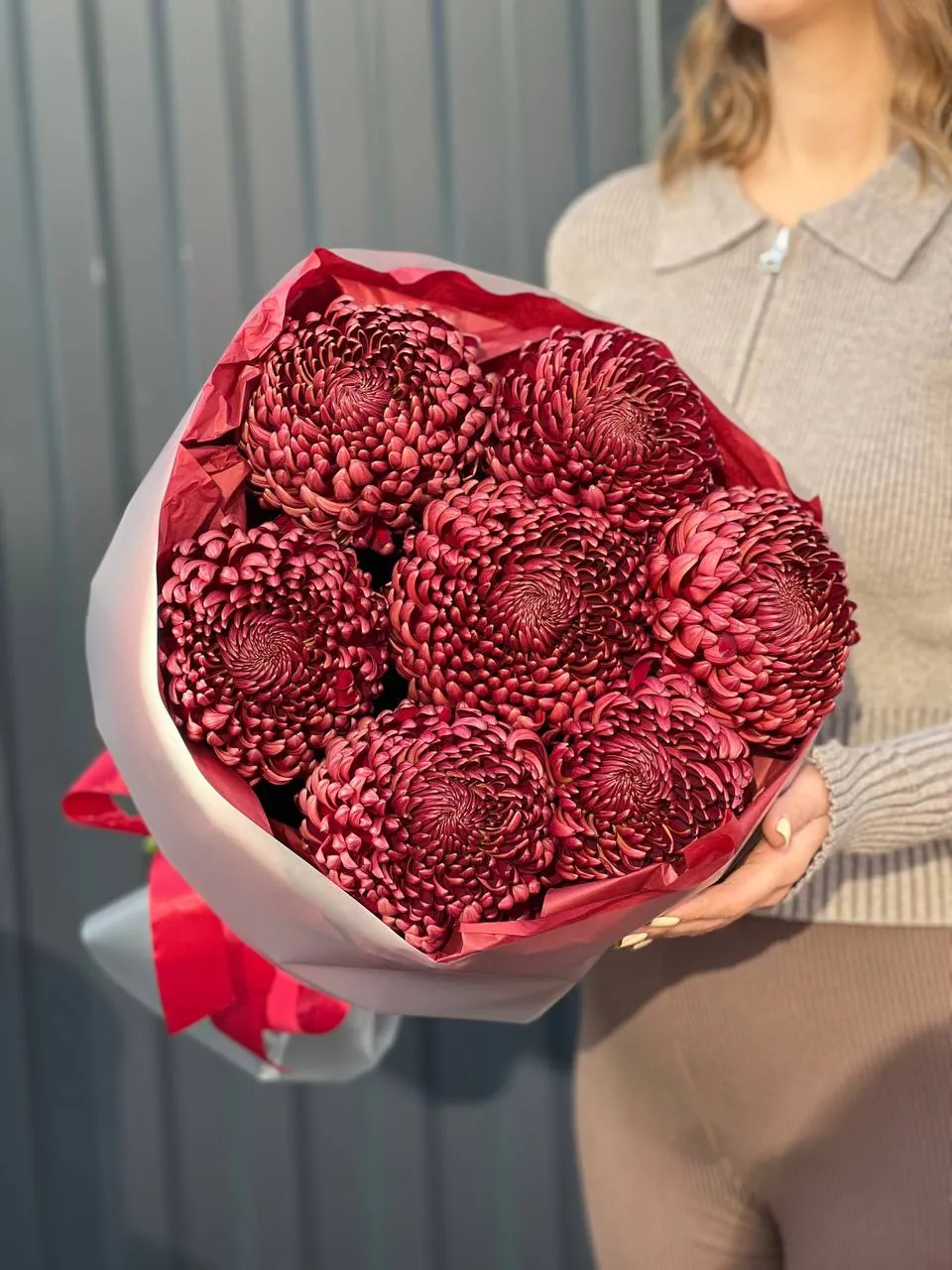 Пышный монобукет из алых хризантем-бигуди. Их кудрявые лепестки, словно языки пламени, дарят тепло и говорят о страсти. Яркое признание в любви без слов.