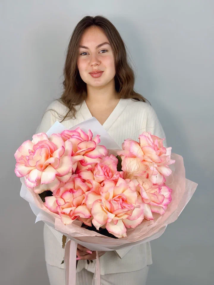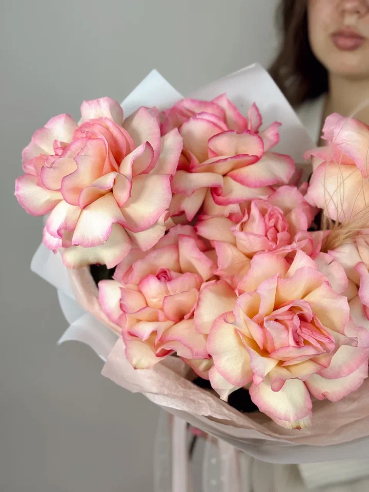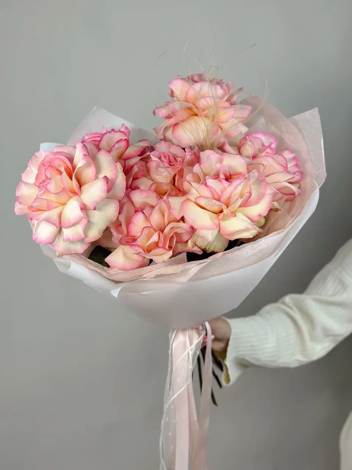 Утончённая роскошь японских роз. Нежно-розовые оттенки переливаются мягким свечением, создавая образ изысканной гармонии. Этот букет говорит о безупречном вкусе и глубокой симпатии, подаренной с особым вниманием.