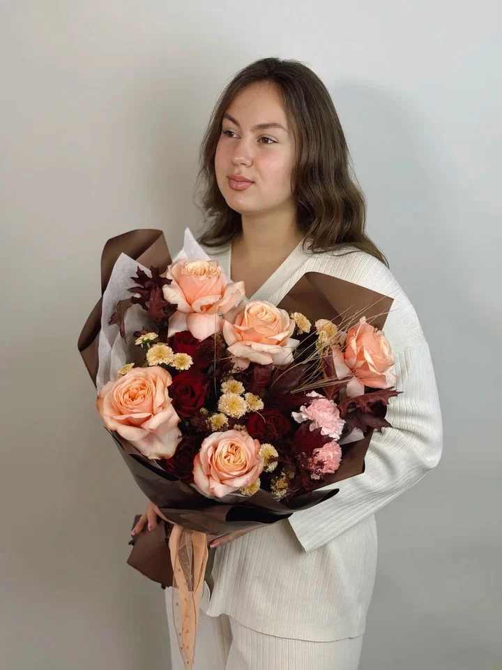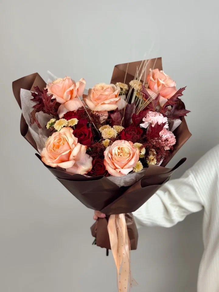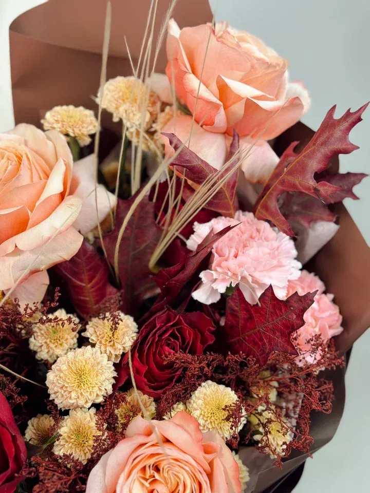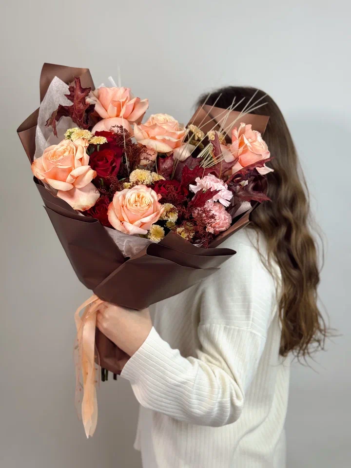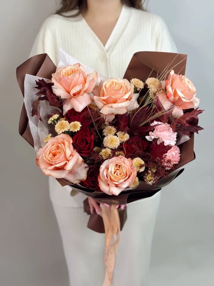 Этот букет в спокойной осенней гамме из роз и куэркуса создаёт уютную и гармоничную атмосферу, напоминая о тёплых вечерах и мягком светлом настроении, наполняя сердце теплом и спокойствием.