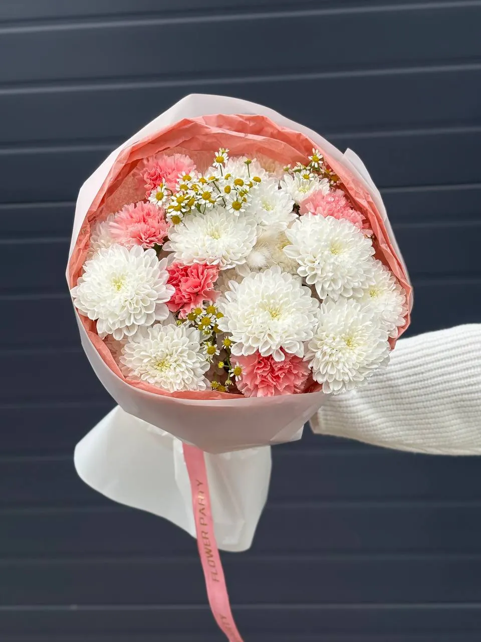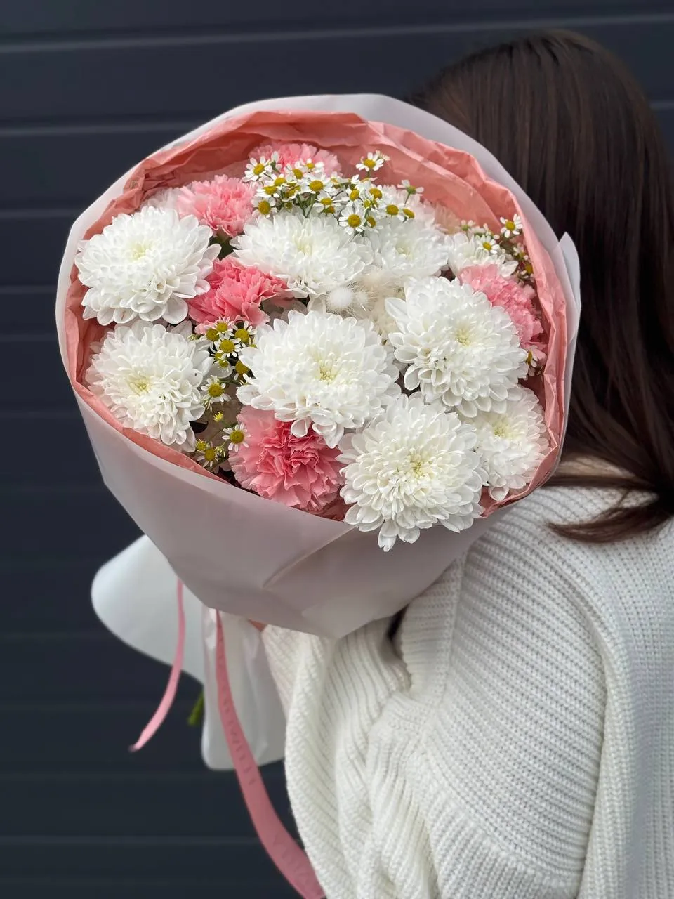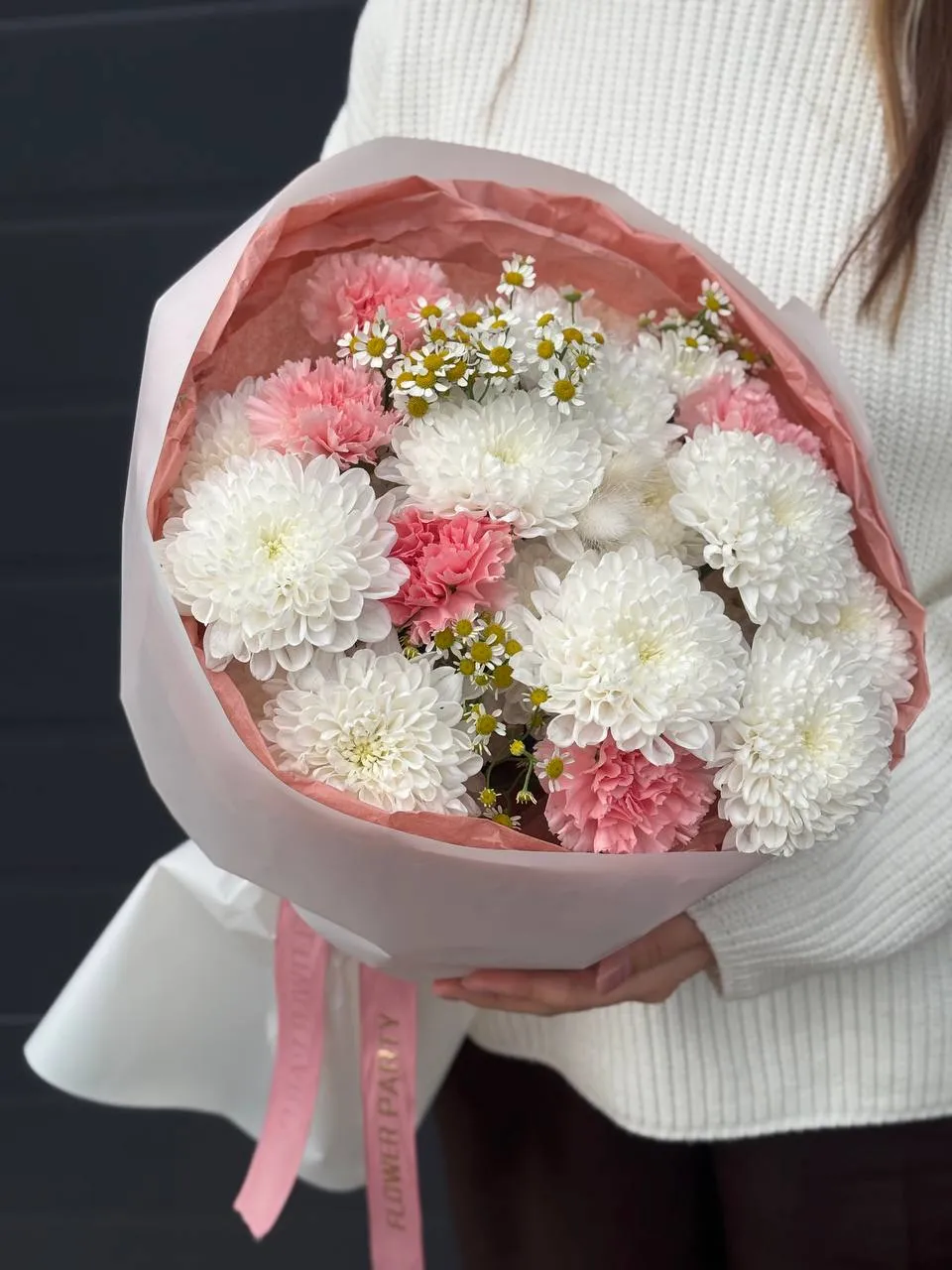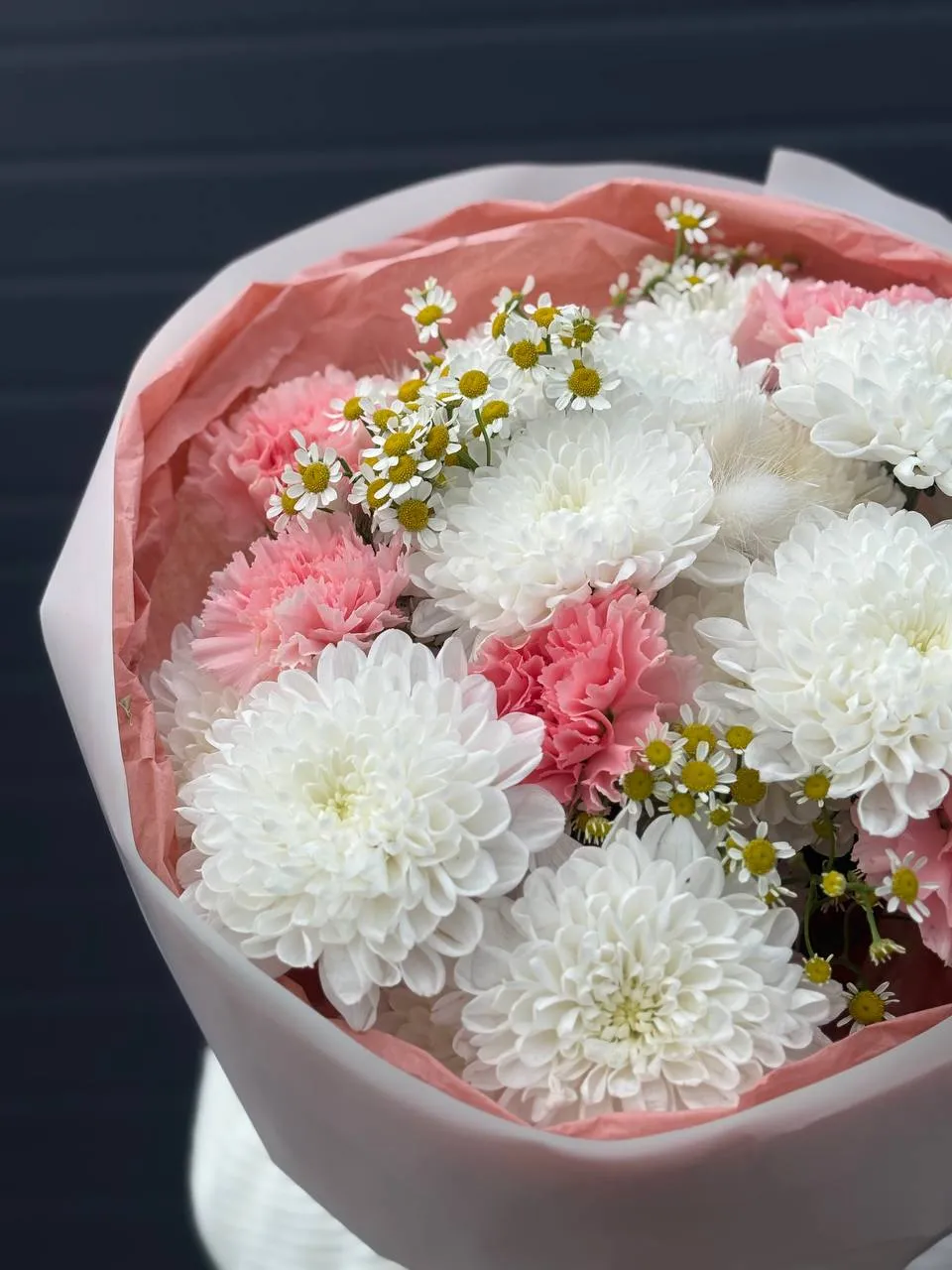 Нежное сочетание белого и розового в трогательном букете. Пушистые хризантемы, милые гвоздики и солнечные ромашки создают образ светлой нежности. Эта композиция дарит ощущение тепла, заботы и безмятежного счастья.
