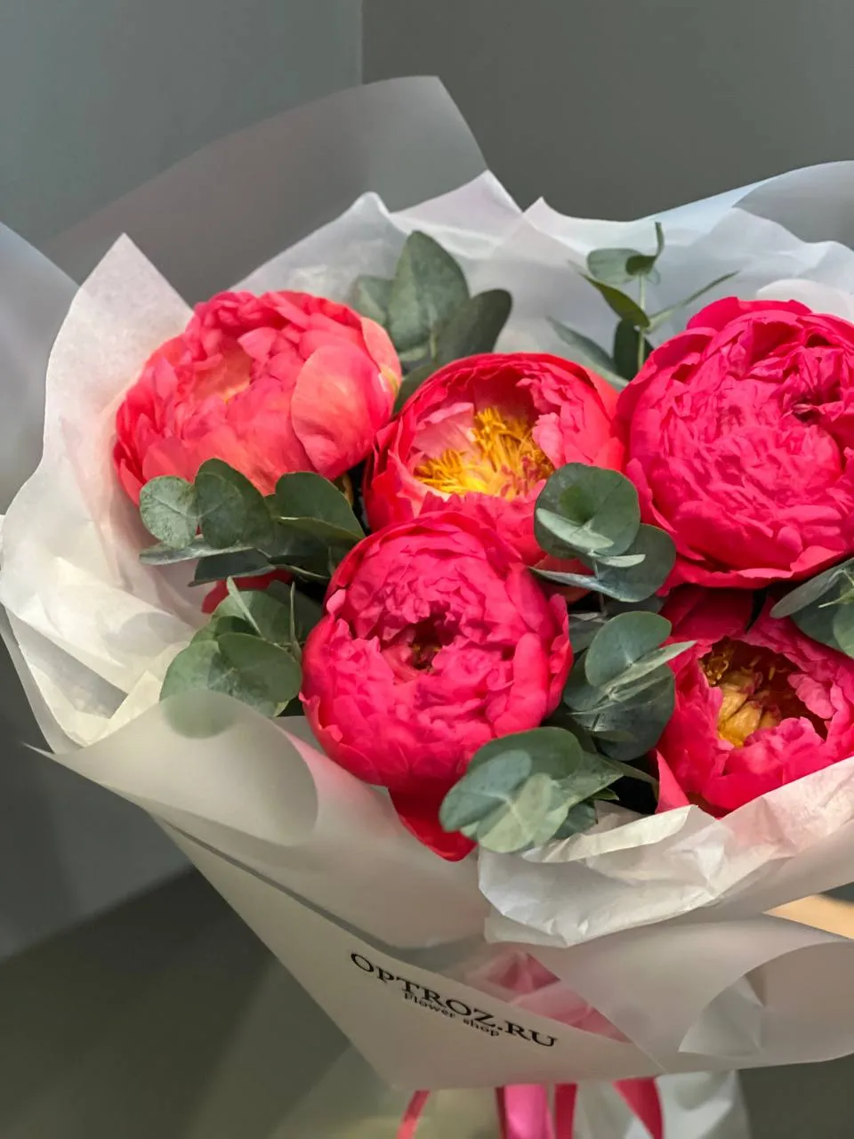 Букет роскошных пионов "Корал Шарм"! Их лепестки от яркого коралла до нежного персика – настоящая магия. Особая ценность: мы получили их вне сезона, даря редкую, эксклюзивную красоту.