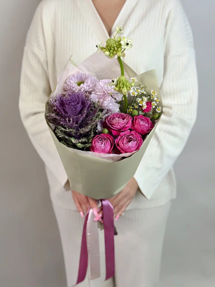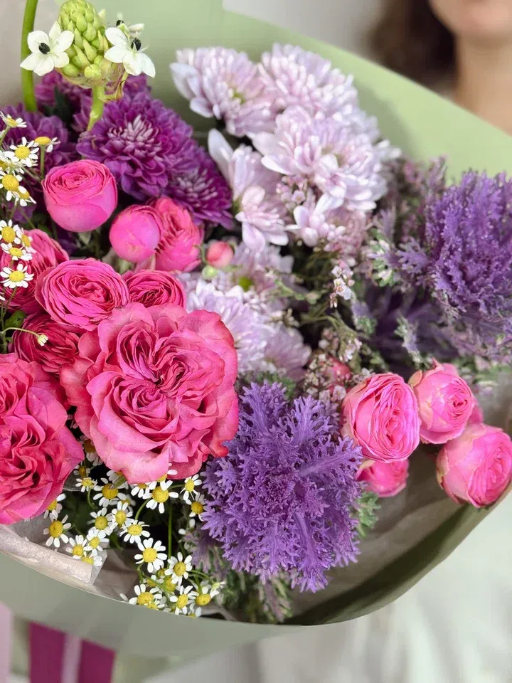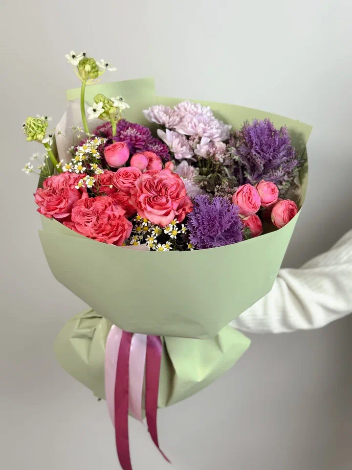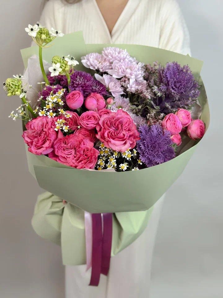 Этот изумительный букет в зелено-сиреневой гамме сочетает кустовые розы, брассики, орнитогалюм и хризантемы, создавая свежий и элегантный образ, наполненный гармонией и утонченностью.