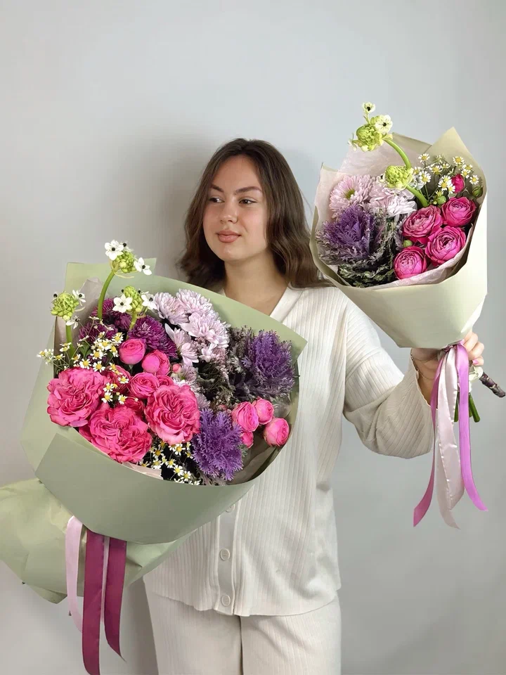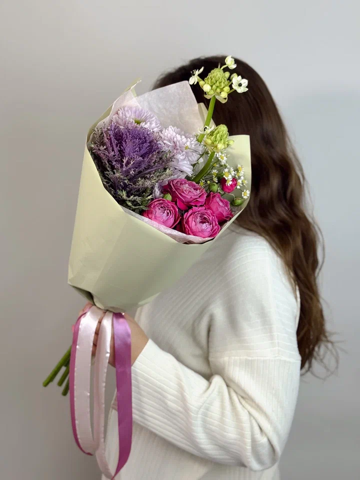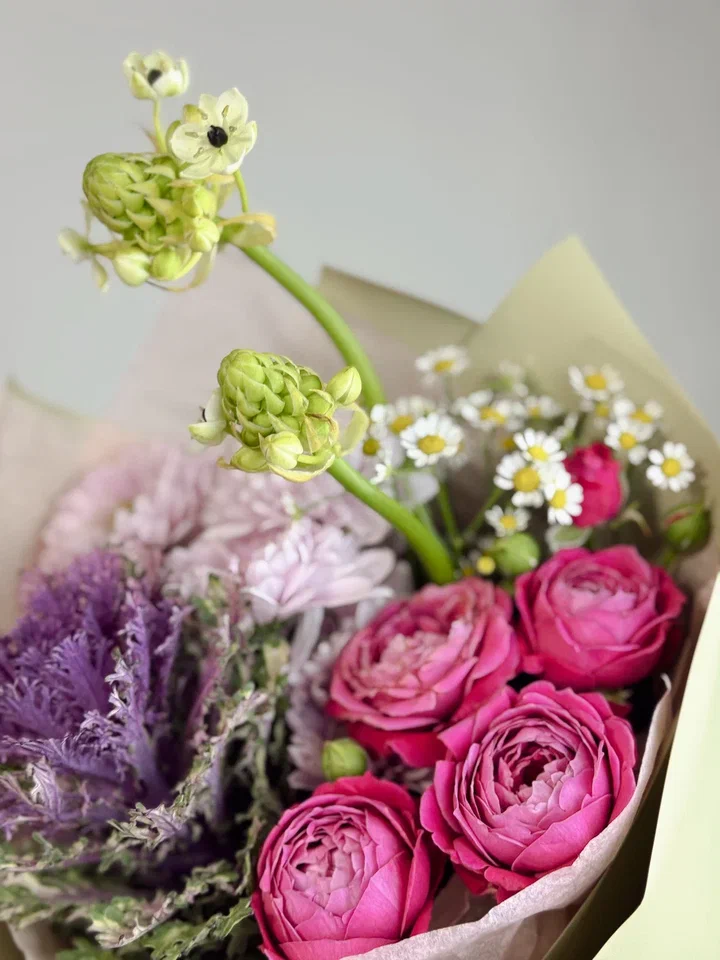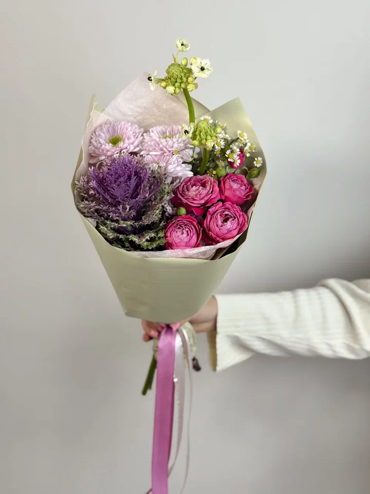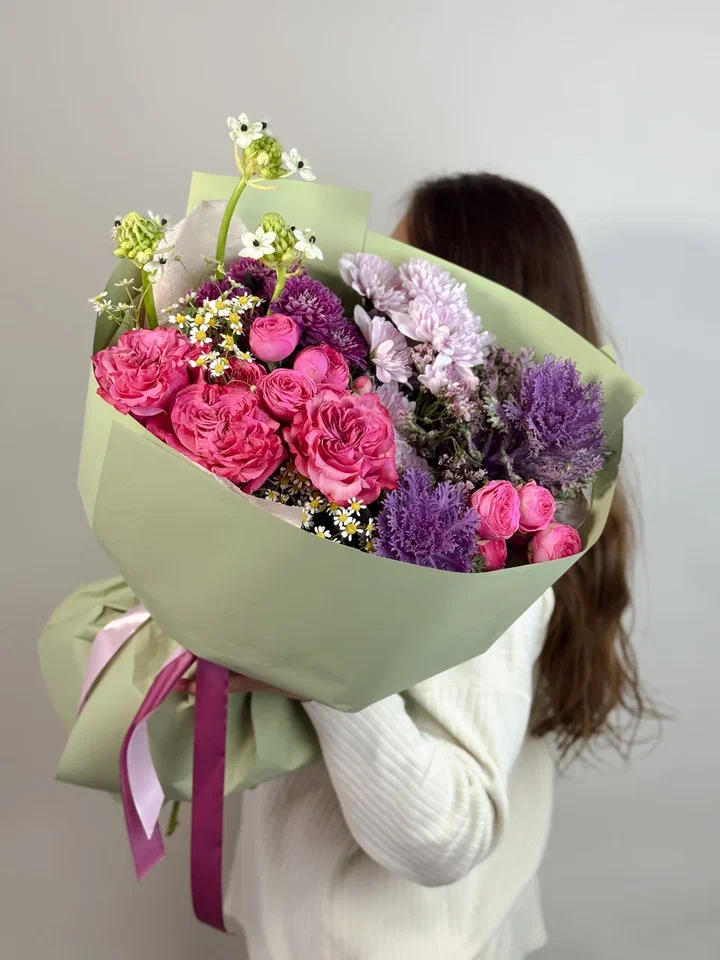 Этот изумительный букет в зелено-сиреневой гамме сочетает кустовые розы, брассики, орнитогалюм и хризантемы, создавая свежий и элегантный образ, наполненный гармонией и утонченностью.