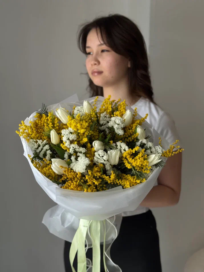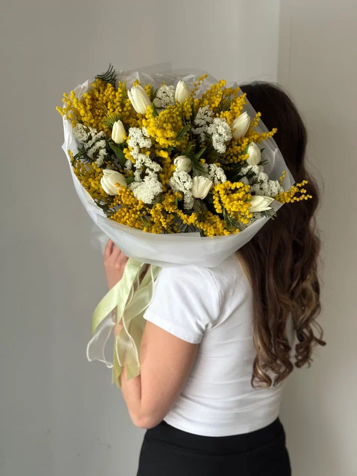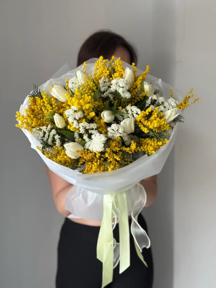 Очаровательный букет из свежих веточек мимозы, символа весны и нежности. Идеальный подарок для поднятия настроения и выражения тепла и любви в любой праздник или просто так.