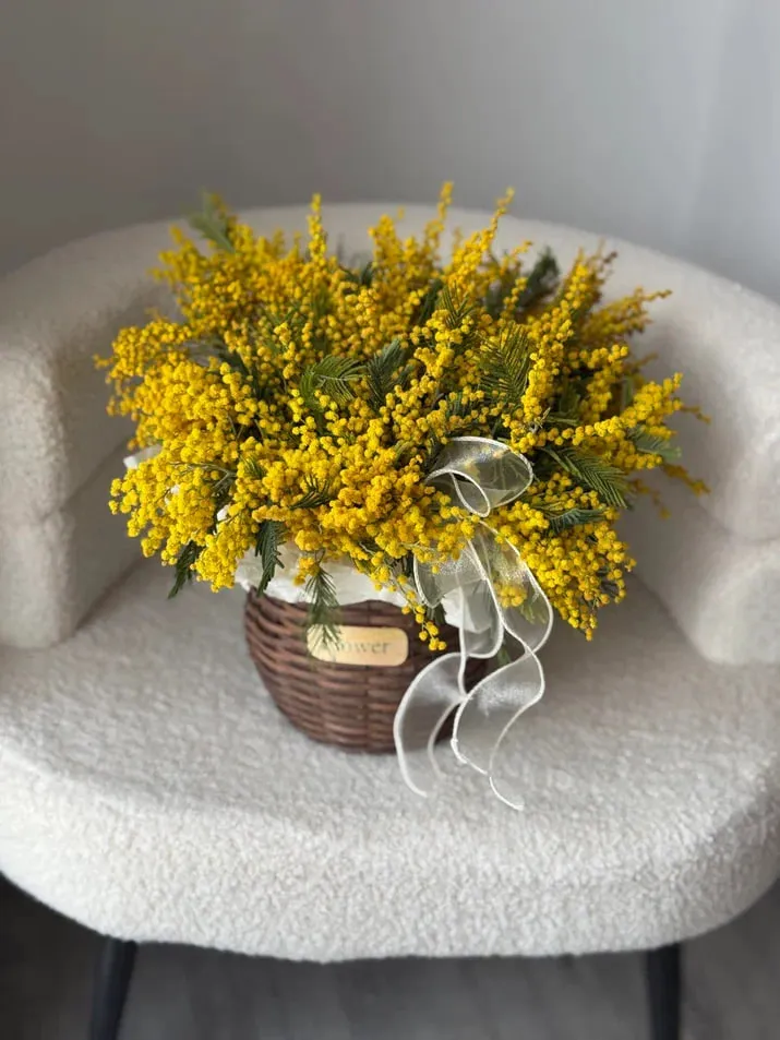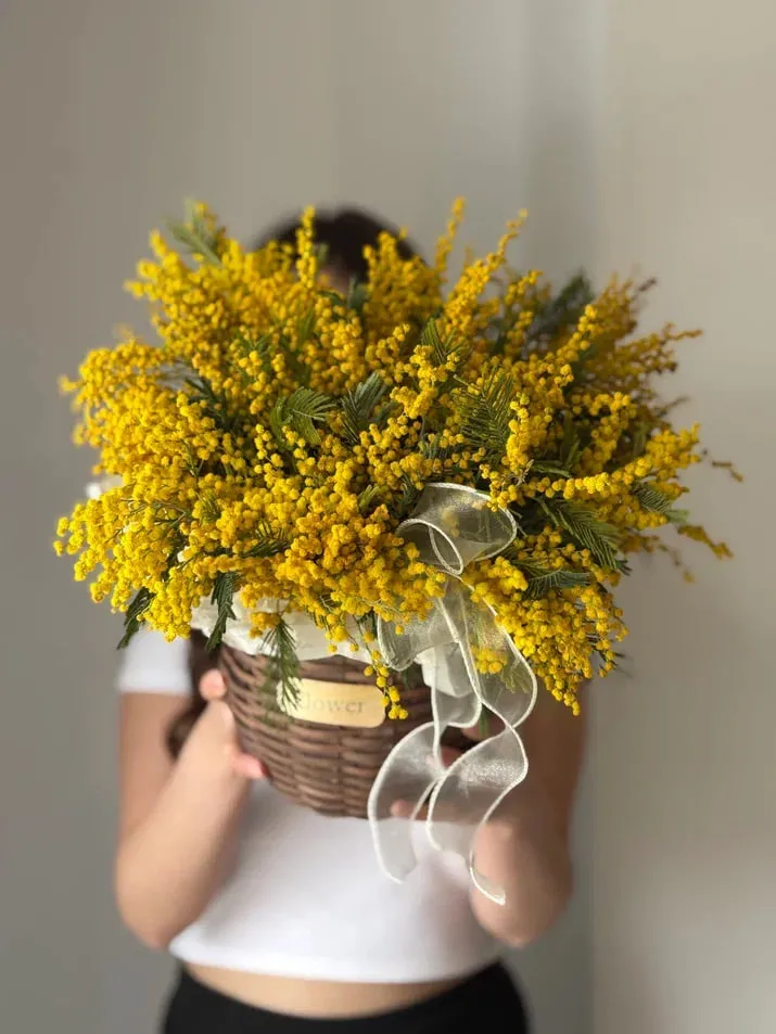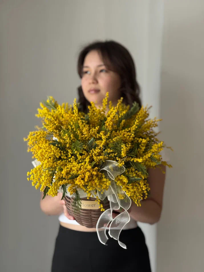 Очаровательный букет из свежих веточек мимозы, символа весны и нежности. Идеальный подарок для поднятия настроения и выражения тепла и любви в любой праздник или просто так.