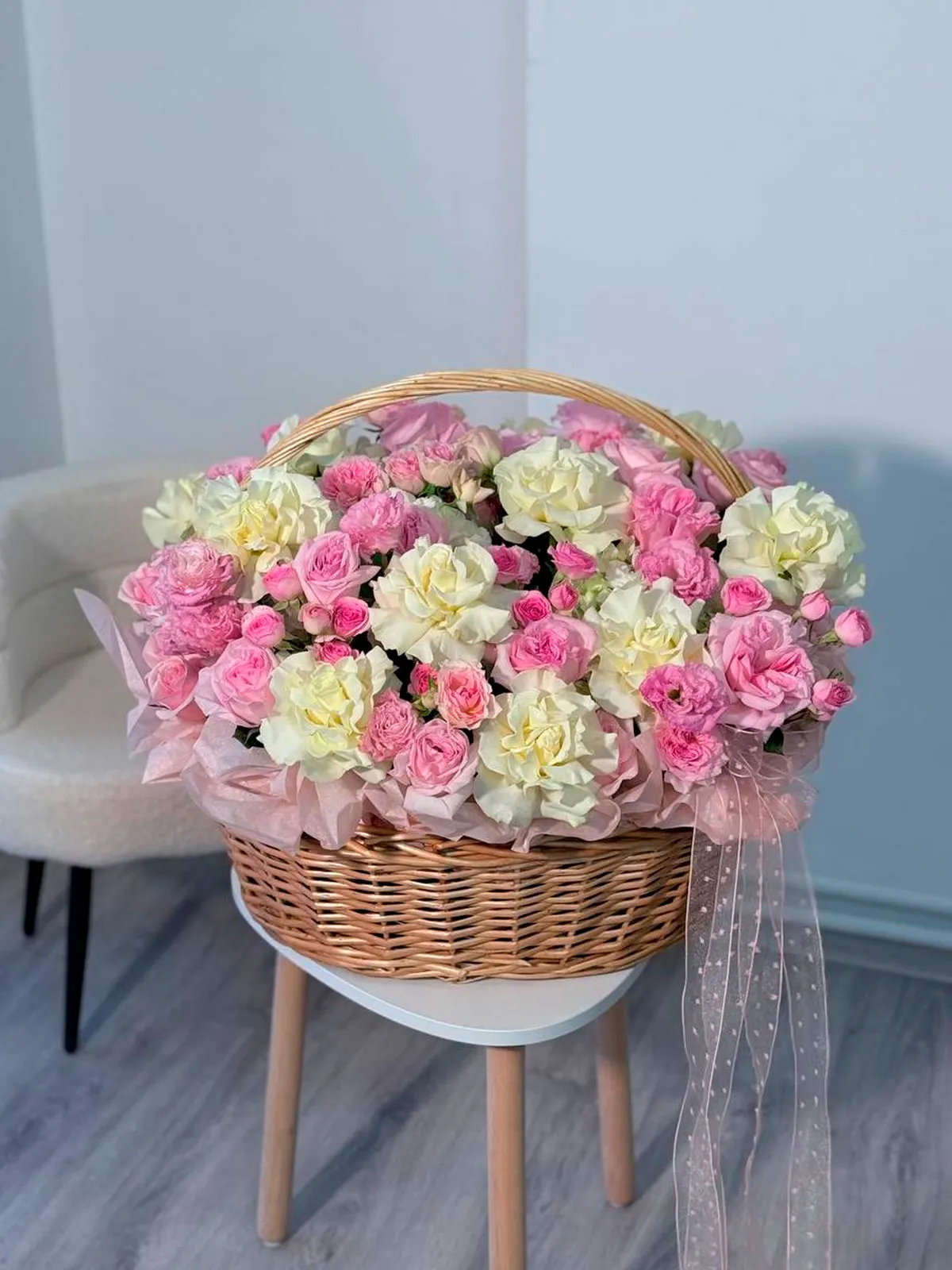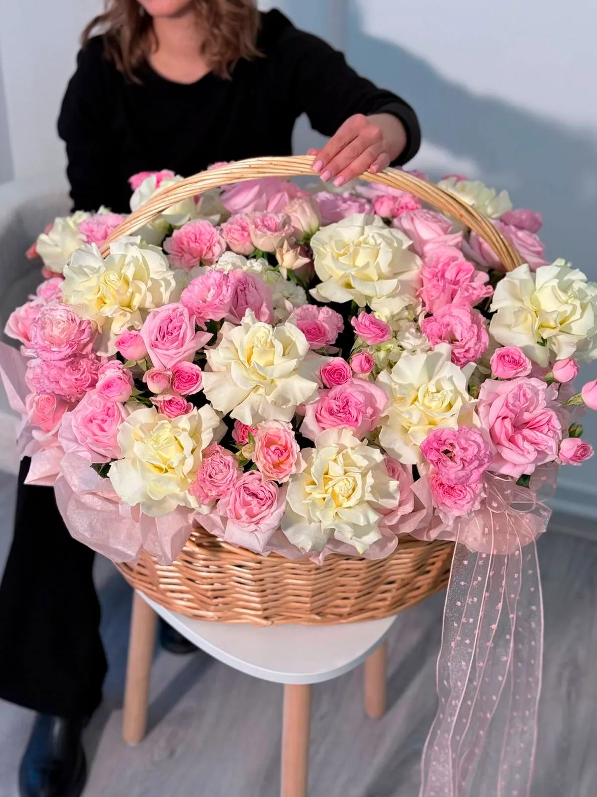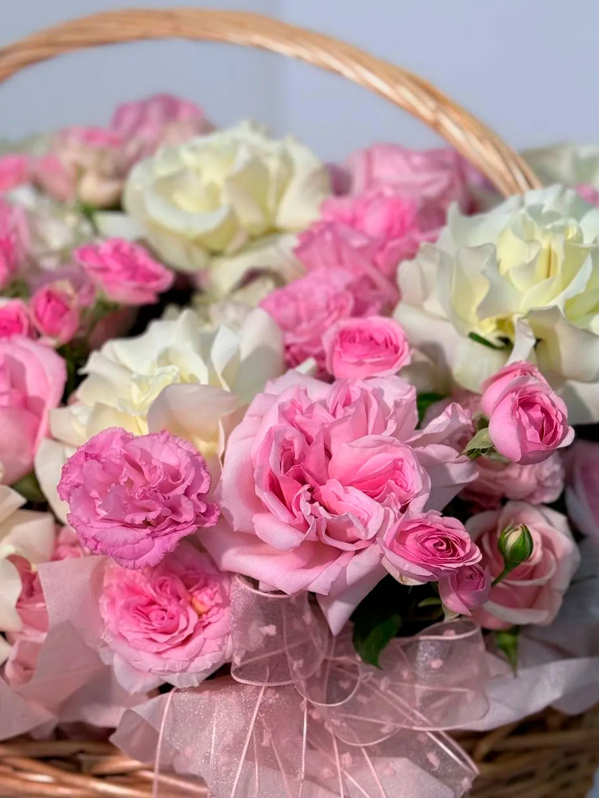Большая корзина цветов, изысканно сочетает розы и эустомы в нежных розово-белых оттенках, создавая элегантный и романтичный букет, который радует глаз и наполняет атмосферу теплом и нежностью.